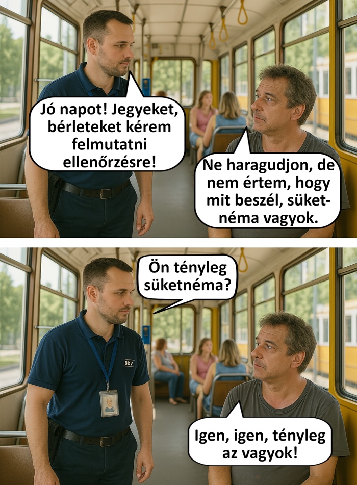Jegyellenőr: Jó napot! Jegyeket, bérleteket…
