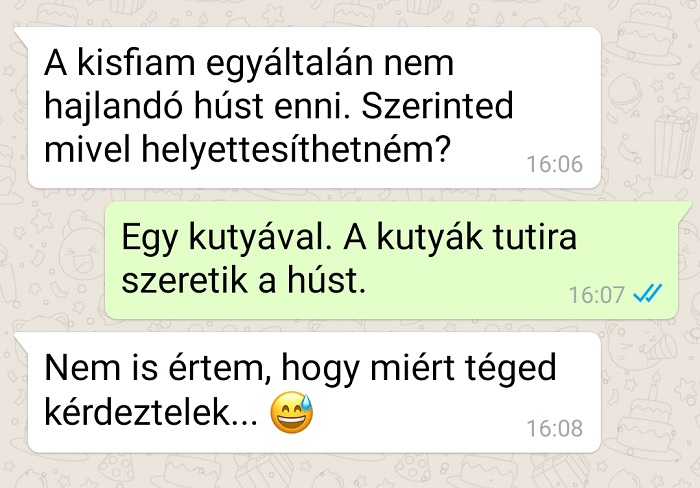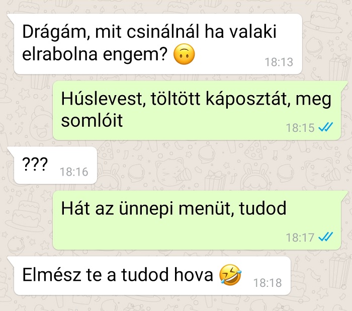 Az emberek úgy általánosságban véve örömet okoz, ha üzenetet kapnak. Persze ez függ attól is, hogy kitől érkezik az adott üzenet, és hogy jó vagy rossz hír van áll benne. Van olyan üzenet, amitől elfancsalodik az ember, van olyan, amitől bosszússá válik, van olyan, ami jobb kedvre deríti, és van olyan is, ami vegyes érzelmeket vált ki. Hogyan ezen üzenetváltások mit hoztak ki a bennük résztvevő személyekből, az igen széles skálán mozog, de annyi biztos, hogy külső szemlélőként mi jól szórakoztunk rajtuk. Reméljük, hogy ezzel ti sem lesztek másképp.