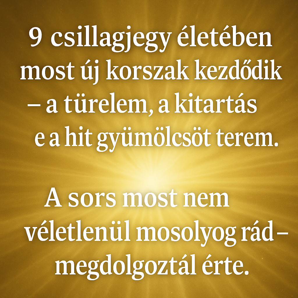 9 csillagjegy életében most új korszak kezdődhet – a türelem, a kitartás és a hit gyümölcsöt terem. A sors most nem véletlenül mosolyog rád – megdolgoztál érte.