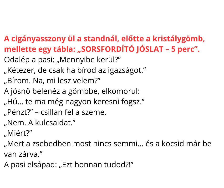 mellette egy tábla: „SORSFORDÍTÓ JÓSLAT – 5 perc”.