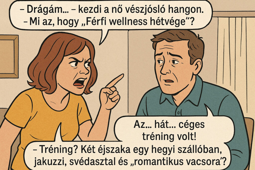 – Drágám… – kezdi a nő vészjósló hangon. – Mi az, hogy „Férfi wellness hétvége”?