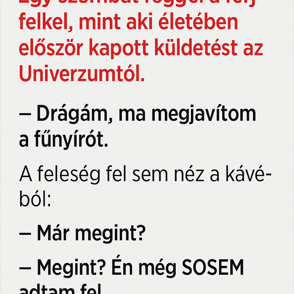 Egy szombat reggel a férj felkel, mint aki életében először kapott küldetést az Univerzumtól.