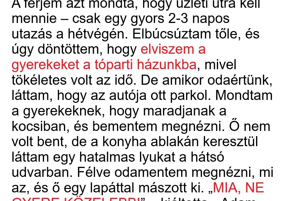 Mia azt hitte, férje, Ádám, munkaügyben utazott, ezért meglepetésként elvitte gyerekeiket a családi tóparti házhoz.