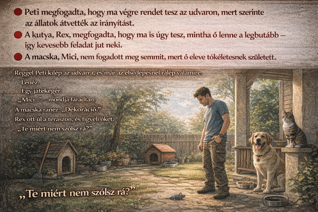 Peti megfogadta, hogy ma végre rendet tesz az udvaron, mert szerinte az állatok átvették az irányítást.