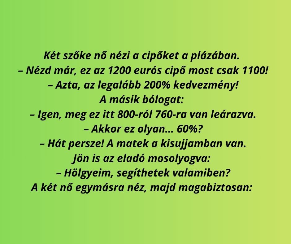 – Nézd már, ez az 1200 eurós cipő most csak 1100!