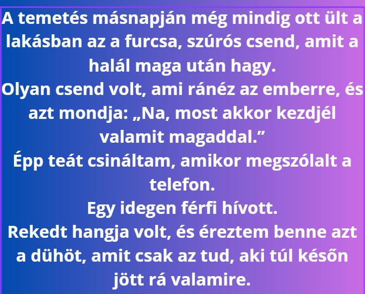 A temetés másnapján még mindig ott ült a lakásban az a furcsa, szúrós csend, amit a halál maga után hagy.