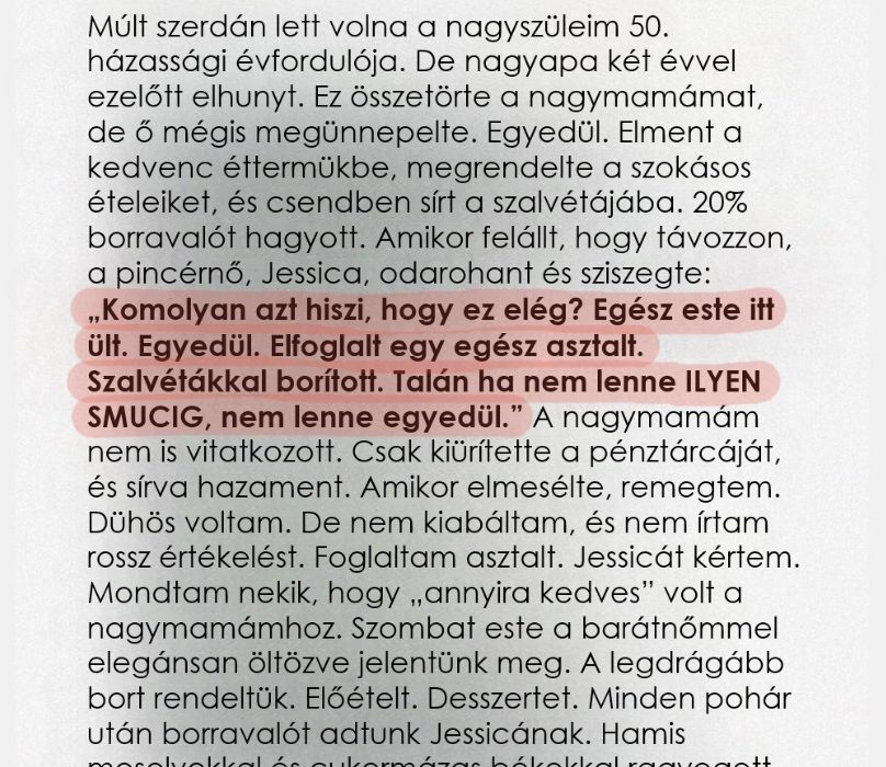 A pincérnő gúnyolta a nagymamám borravalóját, nem számított a válaszomra