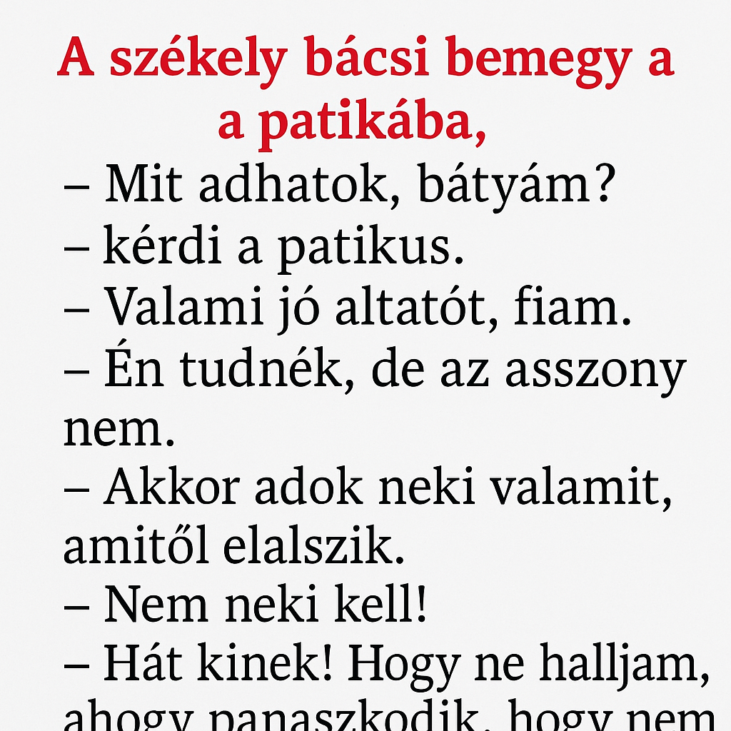 A székely bácsi bemegy a patikába. – Mit adhatok, bátyám? – kérdi a patikus. – Valami jó altatót, fiam. – Maga nem tud aludni???