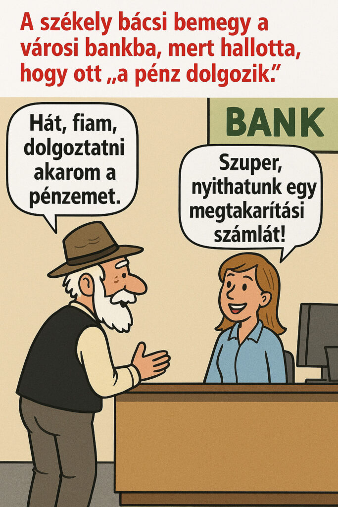 A székely bácsi bemegy a városi bankba, mert hallotta, hogy ott „a pénz dolgozik”.