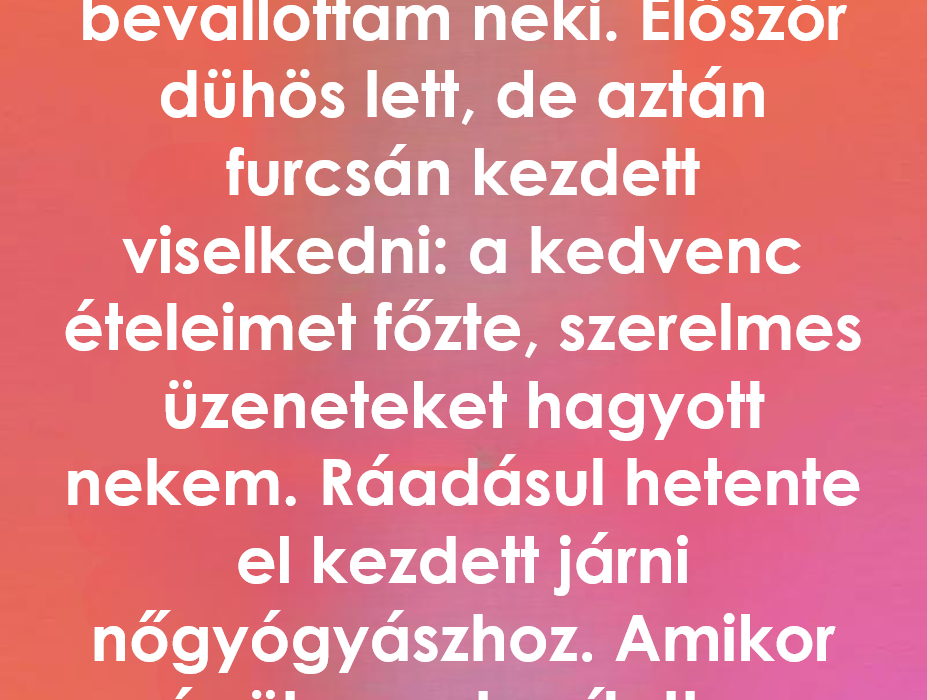 Hetente egyszer elment „a nőgyógyászához”. Könnyed hangon említette, nem firtatta a részleteket. Féltem rákérdezni. Közben egyre jobban aggódtam, hogy talán beteg, vagy valami olyat cipel egyedül, amit tőlem akar megóvni.