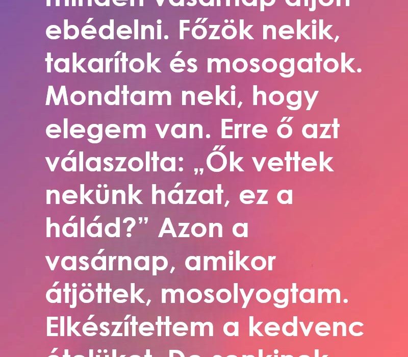 A férje végül mellé ült, kicsit megilletődve. „Ez… igazán jól esik” mondta. Mia elmosolyodott, és így felelt: „Szeretek vendégül látni, de én is a család része vagyok. Nekem is jár egy vasárnap, mint mindenkinek.”