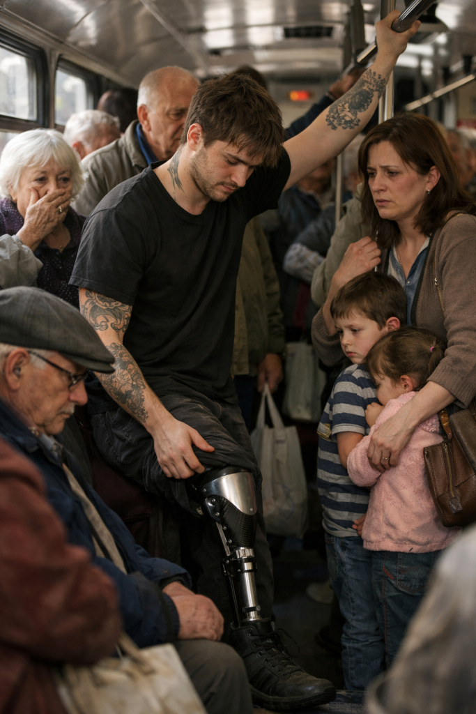 A következő megállónál felszállt egy anya két kisgyerekkel. Az egyik a kezét fogta, a másik szorosan hozzá bújt. Ahogy beljebb léptek, gyorsan kiderült, hogy nincs egyetlen szabad hely sem.