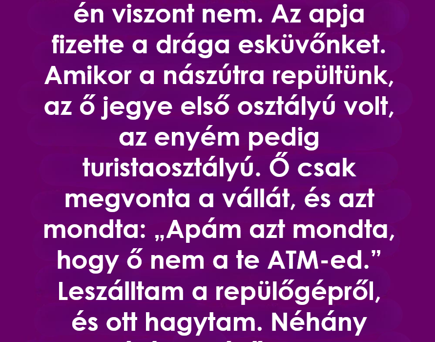 A repülőn szembesült vele, hogy a feleség első osztályon ül, ő pedig a turista sorban kapott helyet. Először félreértésnek hitte. Rákérdezett, mire a feleség könnyedén annyit mondott: „Apa azt mondta, hogy ő nem a te ATM bankautomatád.” Ez a mondat mellkason vágta. Annyi áldozat és tervezés után ez nem kedvességnek tűnt, hanem megalázásnak.