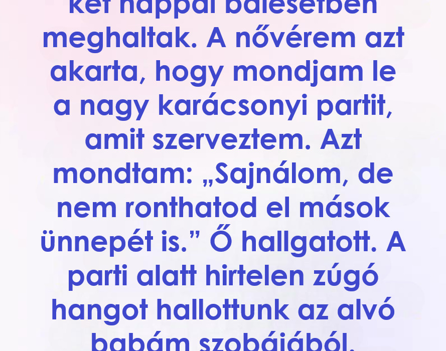 Megkért, hogy mondjam le a hetek óta szervezett karácsonyi bulit. Csendesen kérlelt, mert már nem bírta az ünnepi zajt.