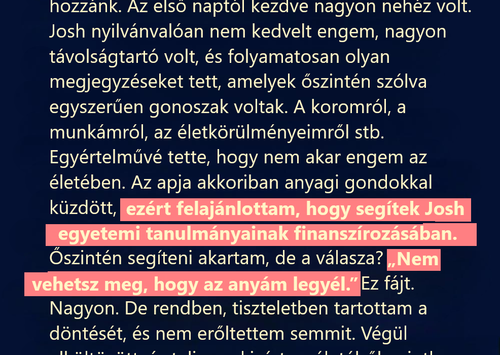 „Tudom, hogy mindenkinek stressz a főiskola ára” kezdtem óvatosan. „Szeretnék segíteni. Kifizetem a tandíjadat.”