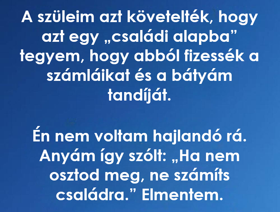 Szinte azonnal felmerült otthon, hogy az összeg kerüljön be a „családi alapba”, amelyből a háztartási kiadásokat és a bátyám egyetemi költségeit fizetnénk. A szüleim szerint ez volt a felelős, felnőttes döntés, és amikor bizonytalan voltam, a csalódottságuk úgy nehezedett rám, mintha mellkasra tett súly lenne.