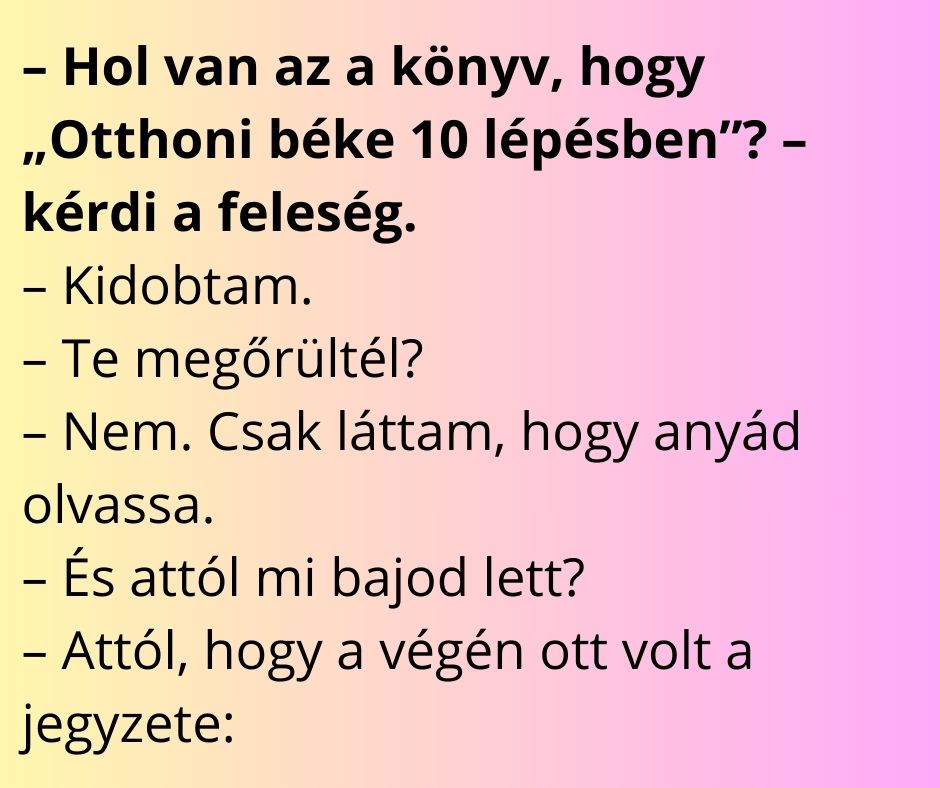 – Hol van az a könyv, hogy „Otthoni béke 10 lépésben”? – kérdi a feleség.