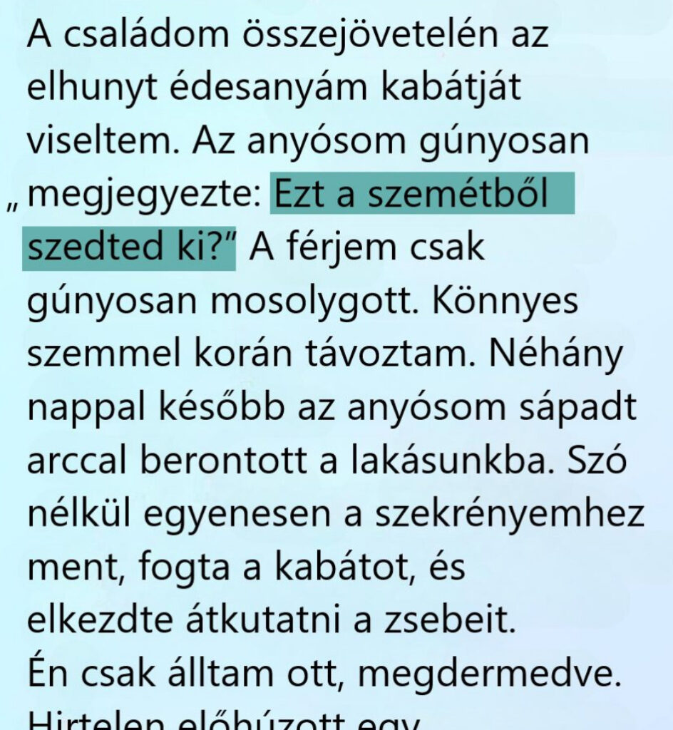 Az anyósom megpördült, és diadalittasan rávágta: „Te mondtad! Te mondtad, hogy az anyja gazdag volt! Hogy ez a kabát rengeteget ér! És tessék, itt a bizonyíték!”