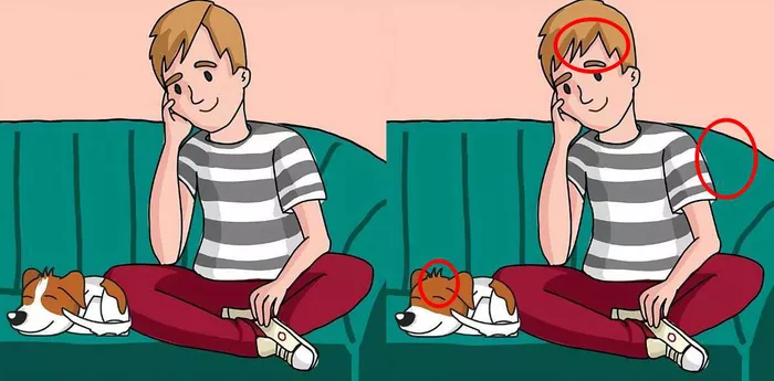 A képeken egy férfi látható a kanapén a kutyájával. Bár a két kép első ránézésre egyformának tűnik, mégsem az. Három különbség van a két kép között. 7 másodperc alatt meg tudod találni a különbségeket?