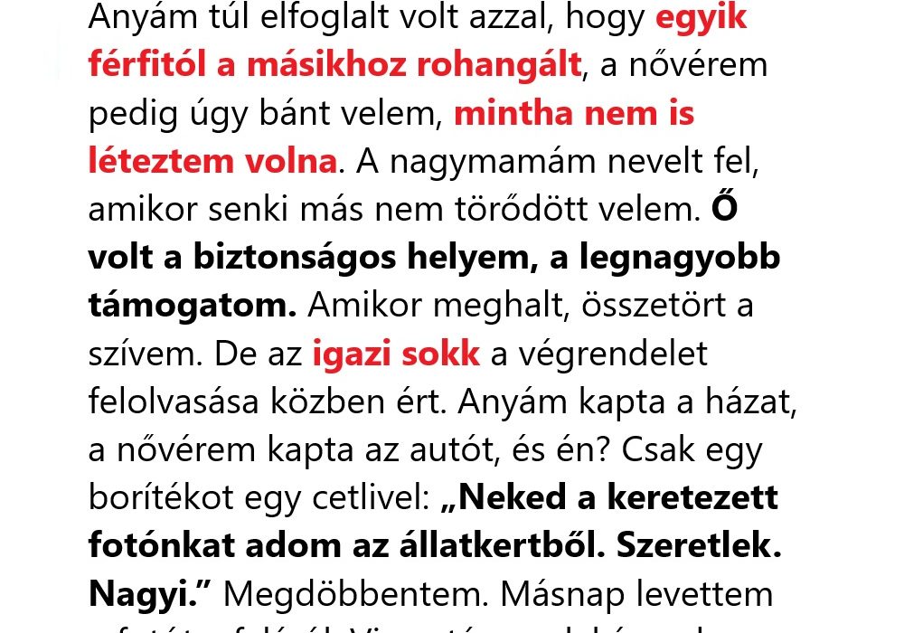 A csomagban egyetlen bekeretezett fénykép volt: nagyi és én az állatkertben, hatéves koromban. A copfjaim ferdén lógtak, az arcom ragadt a félig elolvadt fagyitól, a háttérben egy zsiráf hajolt felénk. Nagyi keze az enyémet fogta, nyugodtan, puhán, türelmesen.