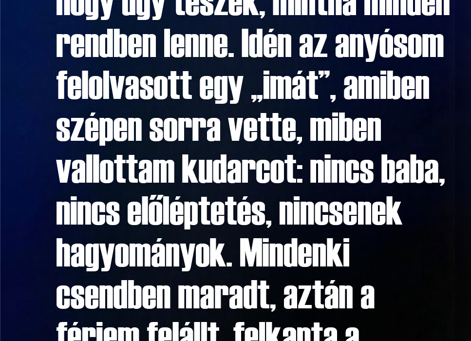 Minden mondat úgy csapódott le, mint egy célzott üzenet. A szoba nem a csendes áhítattól némult el, hanem attól, hogy mindenki értette, miről van szó. Senki nem mozdult. Senki nem szólt közbe. Én ott ültem mosollyal az arcomon, összekulcsolt kézzel, és közben egyre jobban éreztem, hogy kipécéztek.