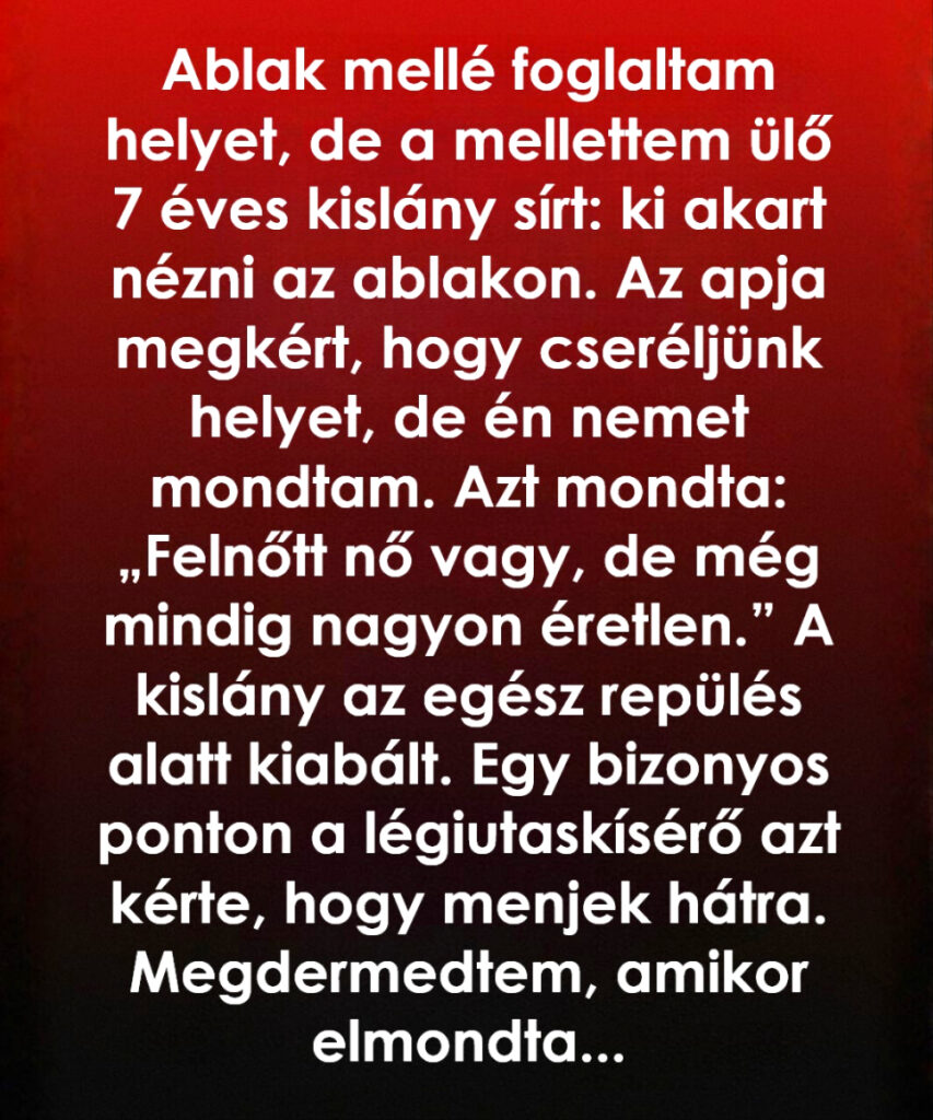 Ahogy gurulni kezdett a gép, az apa udvariasan, de nyomatékosan felém hajolt. Megkérdezte, cserélnék-e ülést, hogy a lánya kinézhessen. Mosolyogtam, és finoman nemet mondtam, elmagyaráztam, hogy ezért a helyért időben foglaltam.