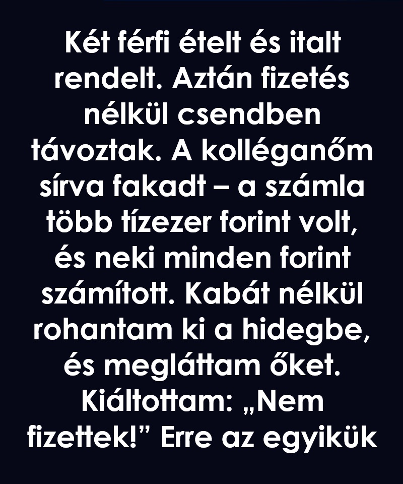 “Igazad van,” mondta halkan. “Nem lopni akartunk. Egyikünk sem dolgozik most, szerettünk volna egy estét, amikor elfelejthetjük a gondjainkat. A végén már nem mertünk a számla elé állni.”