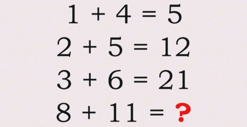 Az első sorban az összeadás helyes: 1 + 4 = 5. Ezután hozzáadjuk a második sor egyenlőség jele előtti számokat, megkapjuk a 12-t. És így tovább. Eszerint a logikai lánc szerint a helyes válasz a 40-es szám.
