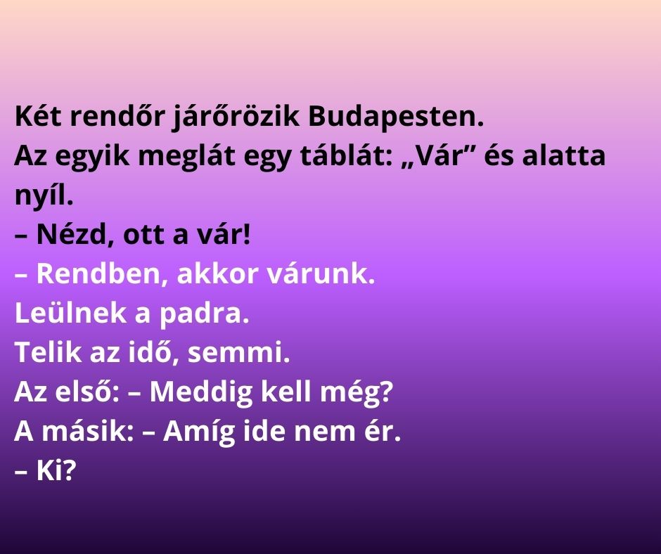 Két rendőr járőrözik a belvárosban, és meglátnak egy táblát: „Behajtani tilos”.