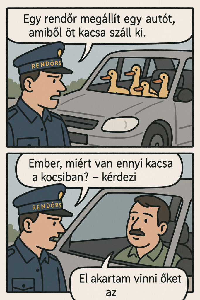 Egy rendőr megállít egy autót, amiből öt kacsa száll ki.