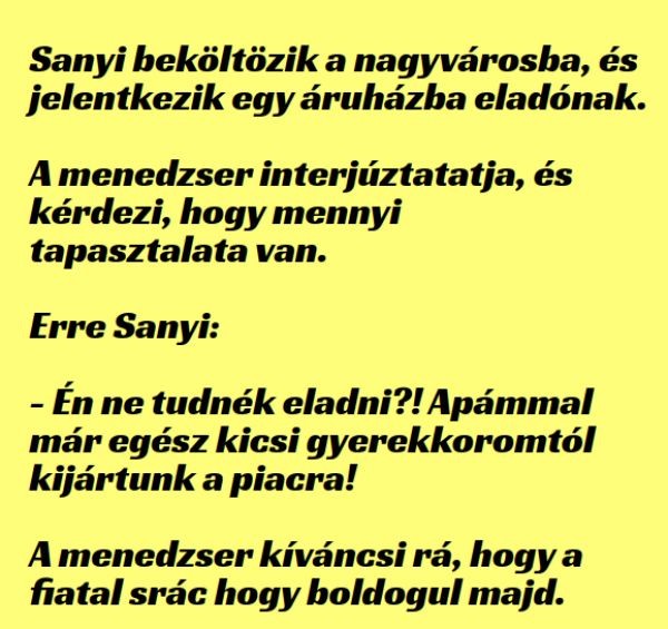 Sanyi beköltözik a nagyvárosba, ésjelentkezik egy áruházba eladónak.