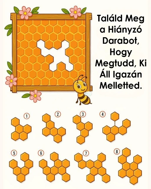 A képen egy méhsejtből álló kirakó látható, amelyből hiányzik egy elem. A feladat egyszerű: válaszd ki azt az alakzatot, amely szerinted pontosan kitölti az üres részt.