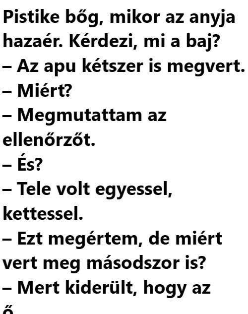 Pistike bőg, mikor az anyja hazaér. Kérdezi, mi a baj?